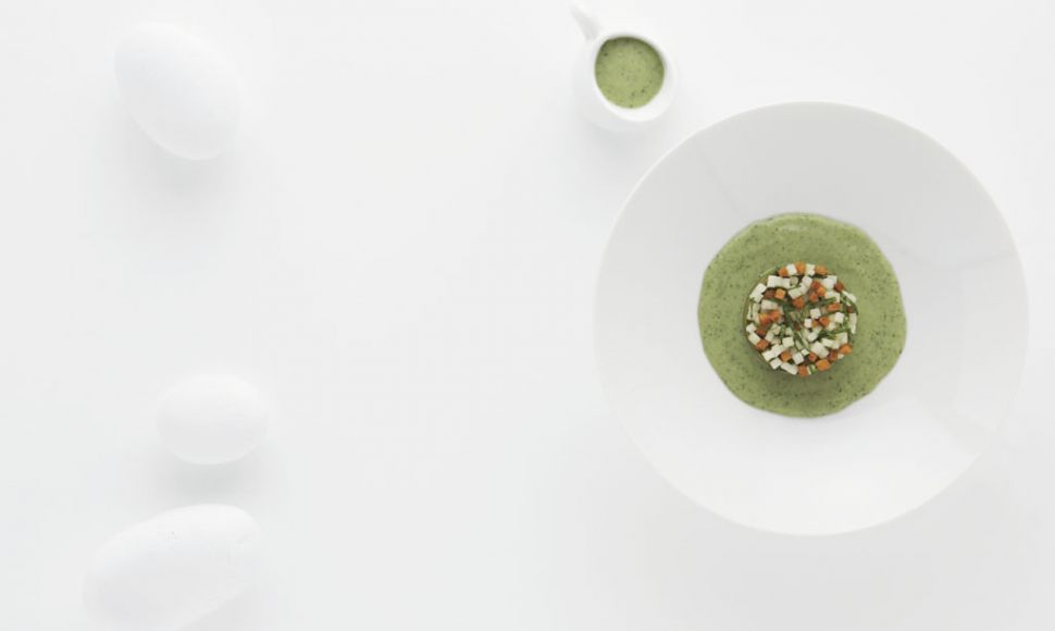 Gaspacho yaourt/concombre mariné à la menthe, royale d’avocat et garniture croquante