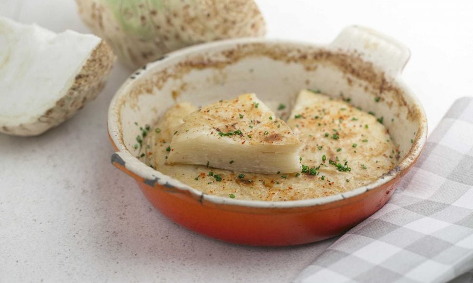 Une superposition de tranches de céleri finement assaisonnées, délicatement dorées au four.