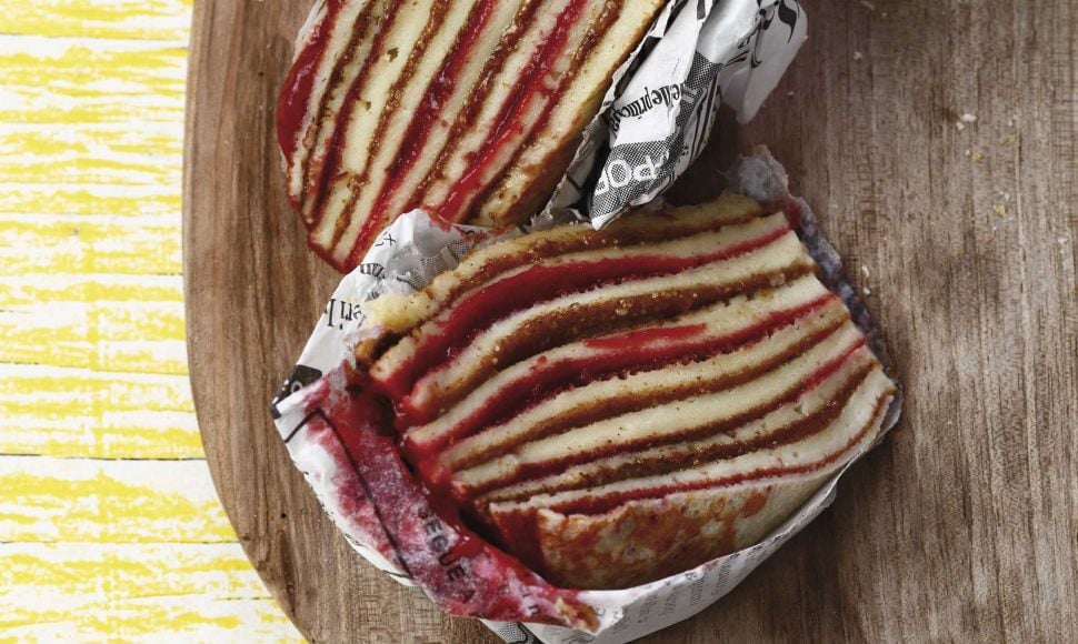 Un mille-feuilles de crêpes soufflées, agrémentées de confit de framboise et de praliné amande.