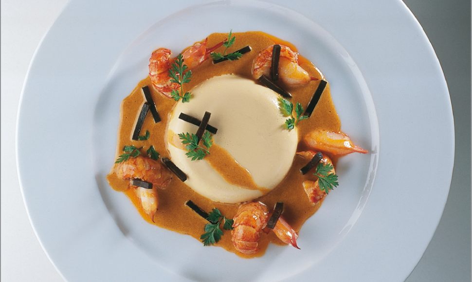 Gâteau de foies blonds de poularde de la bresse baigné de sauce aux queues d’écrevisse à la lucien tendret