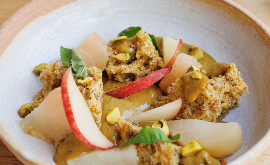 Gâteau vapeur pistache, pêches pochées, pâte de pistache