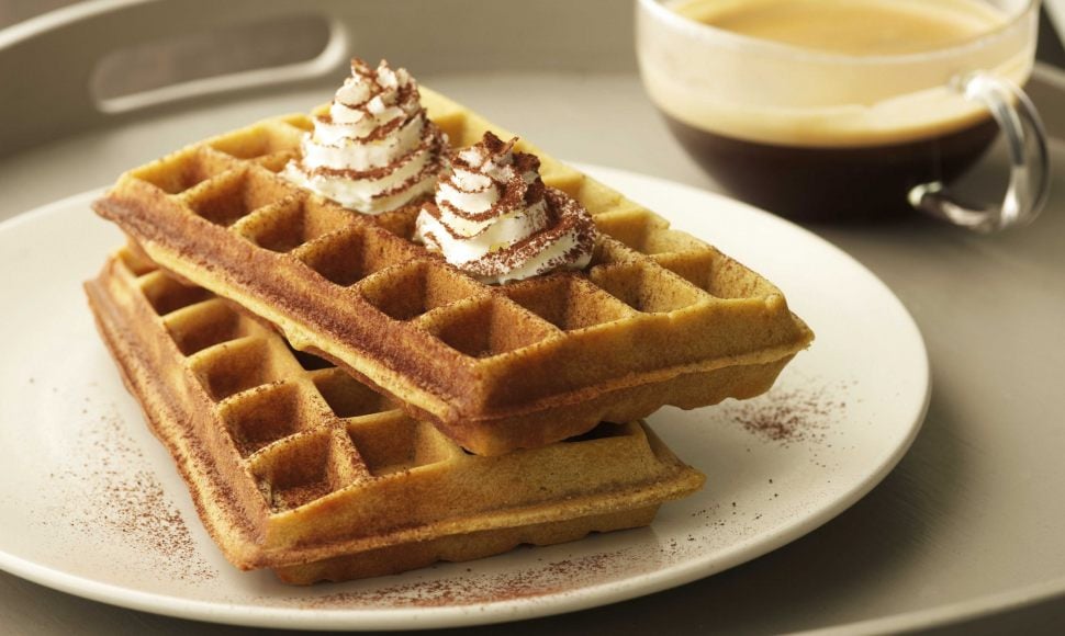 Une gaufre au café et sucre perlé, agrémentée d'une chantilly café et perles craquantes au chocolat.