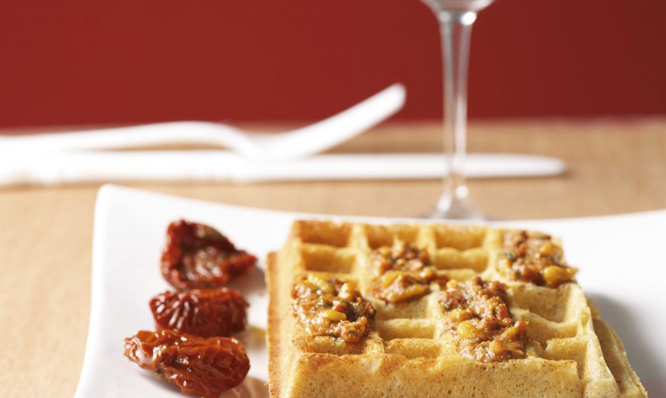 Des gaufres au sarrasin et parmesan, à tartiner d'un pesto légèrement sucré aux tomates séchées, pignons de pin, ail et basilic.