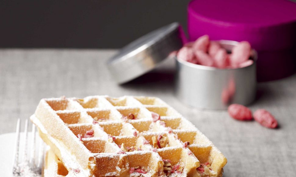 Une gaufre au lait d'amande, pralines en poudre et concassées, saupoudrée de sucre glace.