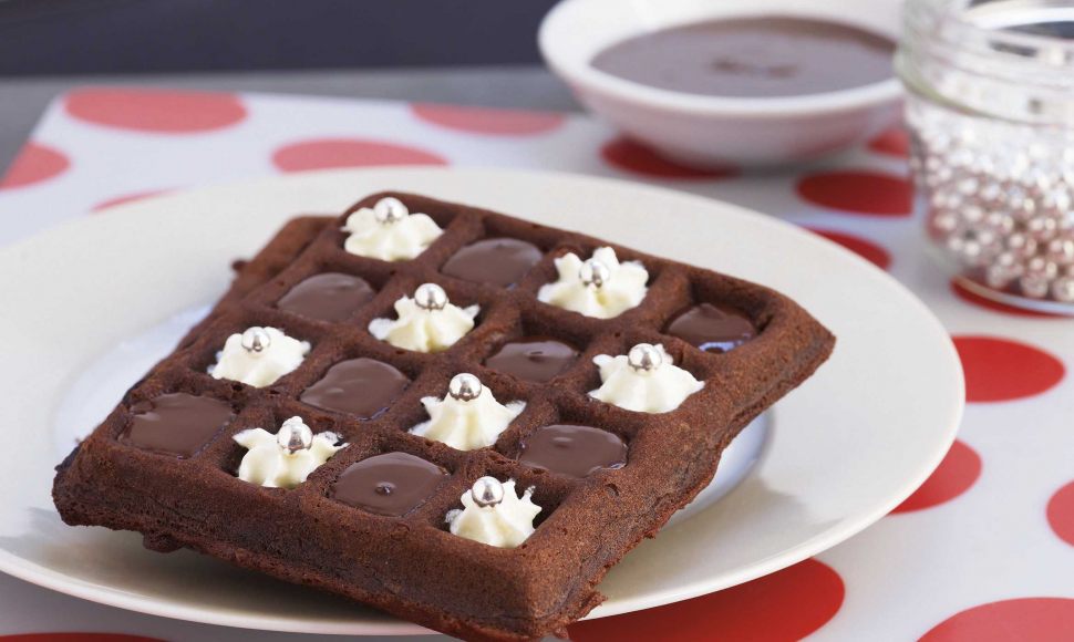 Des gaufres à la pâte au cacao, agrémentées de chocolat noir fondu et de crème chantilly pour tempérer son amertume.