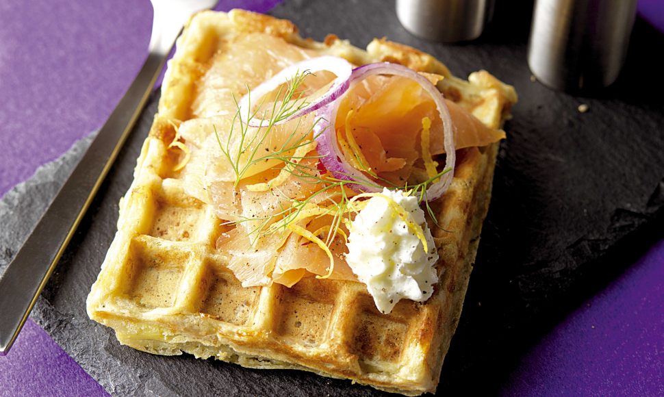 Une gaufre de pommes de terre, agrémentée de saumon fumé, d'aneth, d'oignon et d'un zeste de citron jaune.