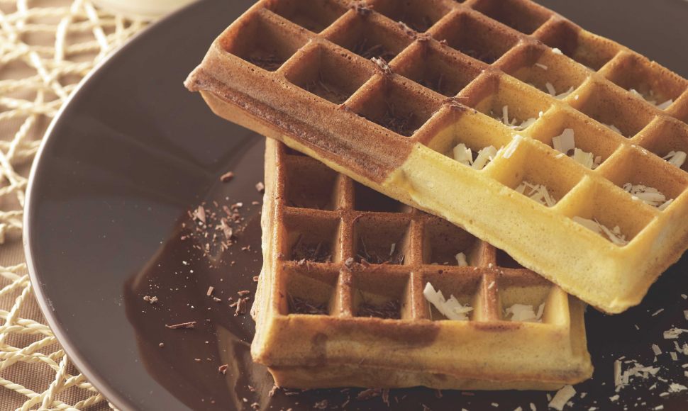 Décorez ces gaufres avec des petits copeaux de chocolat.