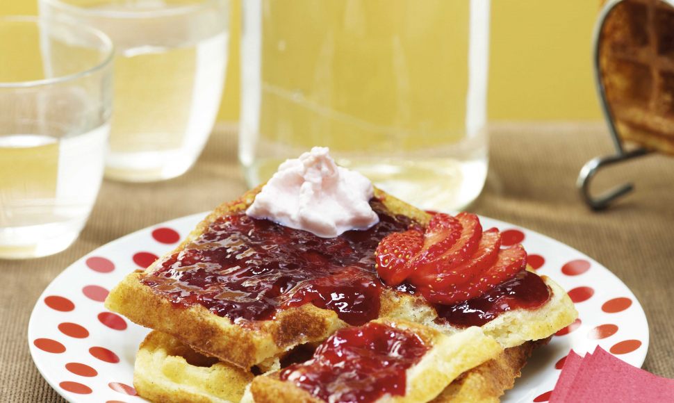 Des gaufres vanillées, agrémentées de fraises en morceaux et en confiture.