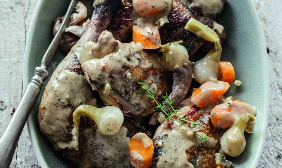 Ancienne race de volaille typiquement tourangelle, la géline avait presque disparu dans les années 1970, balayée par des races anglo-saxonnes à croissance plus rapide et donc plus rentables. À l’initiative de la société avicole, elle a pu être relancée grâce aux efforts d’une poignée d’éleveurs, dont Christine, à qui j’ai eu la chance de rendre visite. Nourries sans granulés ni soja, élevées en liberté dans un jardin merveilleux, ces poules ne pouvaient que donner le meilleur d’elles-mêmes. Merci à Béatrice, l’une des plus fines cuisinières de Touraine, pour m’avoir transmis sa précieuse recette.