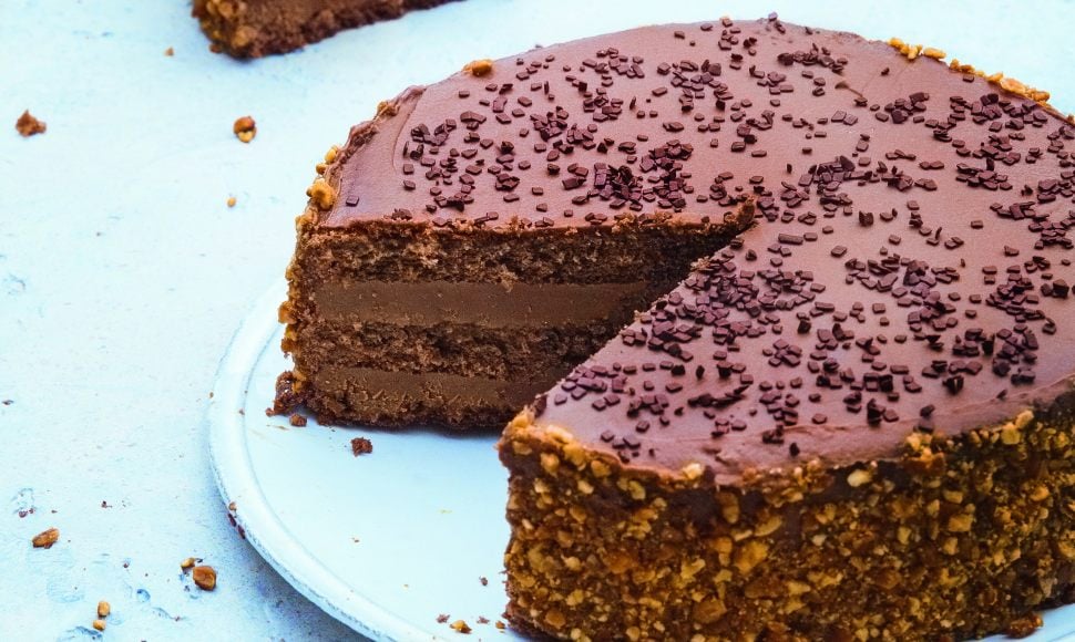 Lissez la ganache si nécessaire et recouvrez complètement le gâteau. Appliquez le pralin sur les bords. Rayez ou décorez la surface avec des copeaux, du vermicelle ou des billes croustillantes. Vous pouvez chauffer légèrement la ganache au bain-marie pour obtenir un mélange bien homogène.