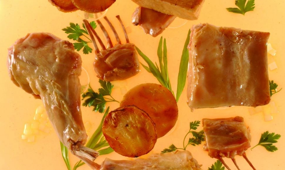 Retirer les poumons et toutes les parties trop grasses des avants de lapin. Détailler les avants en morceaux de 50 g pièce. Éclater les os pour qu’ils puissent libérer le maximum de gélatine. Saler.