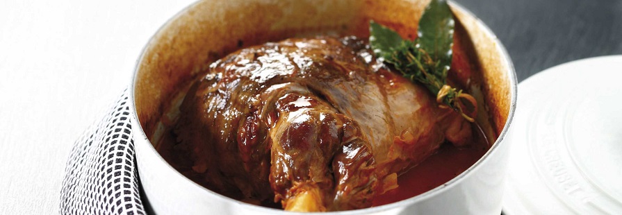 Tapissez le fond de la cocotte avec les tranches de lard et posez le gigot dessus. Ajoutez les oignons, les carottes, le laurier, le thym et l’ail. Délayez le concentré de tomate avec le vin et versez-le dans la cocotte. Complétez avec 30 cl d’eau. Salez et poivrez puis portez à ébullition. Couvrez et réduisez le feu. Laissez cuire à très petits frémissements pendant 7 h.