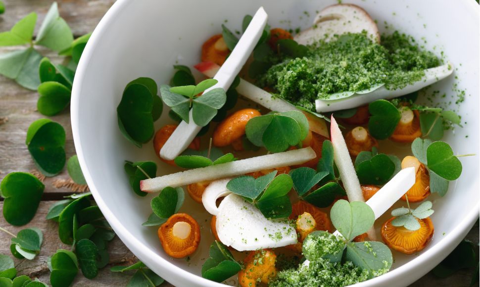 Girolles clous, gelée de mélisse, granité d'oxalis, parfums des bois