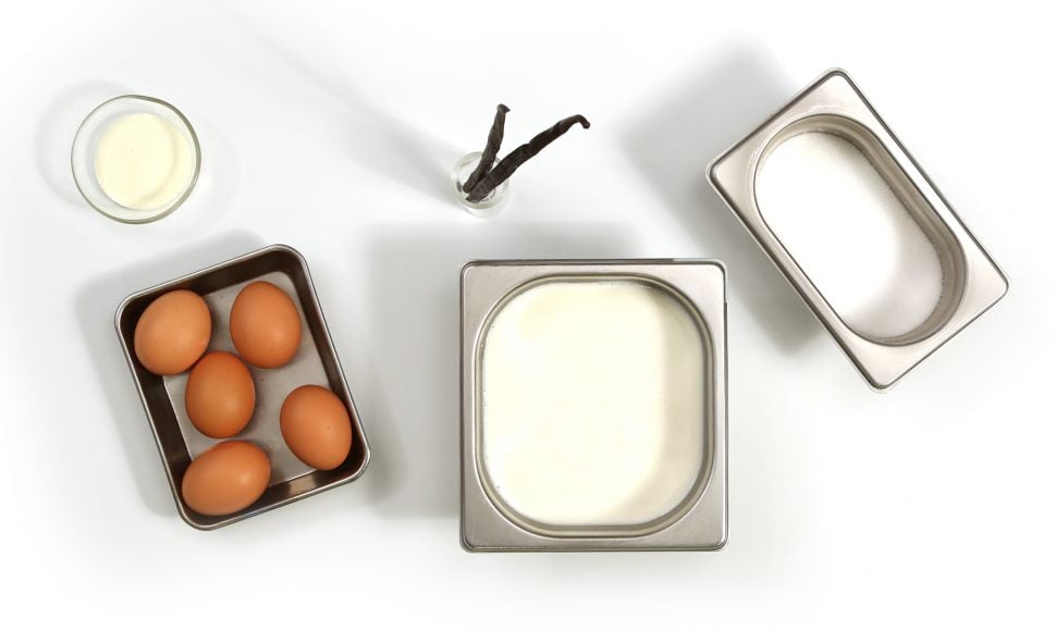 Blanchir les jaunes avec le sucre. Ajouter le lait, la poudre de lait et les gousses de vanille grattées. Cuire au bain-marie à 83 °C.