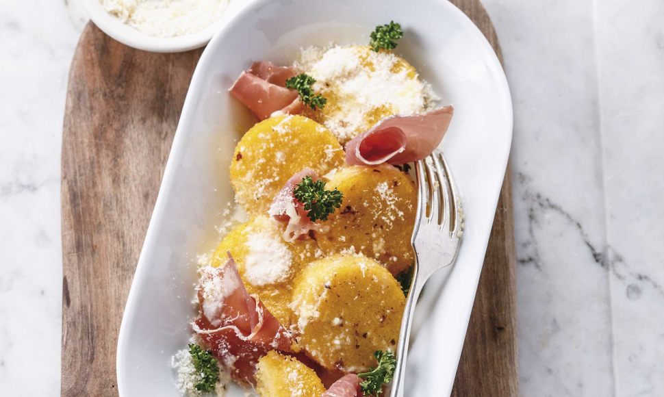 Des plats de gnocchi à la romaine à base de semoule fine, crème de grana padano et jambon cru.