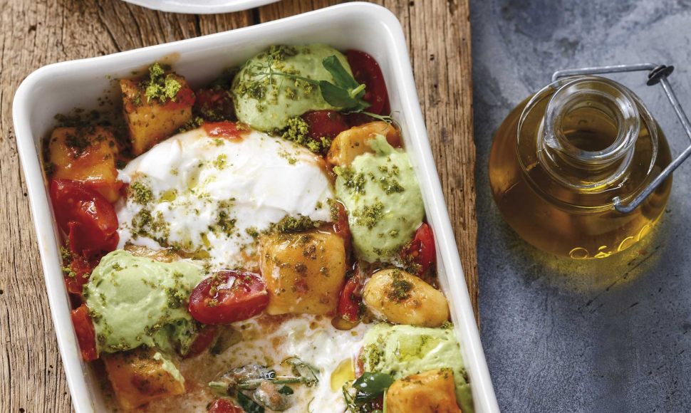 Un plat de gnocchi en gratin qui reprend les ingrédients de la pizza margherita : mozzarella, crème, tomates cerises, basilic.
