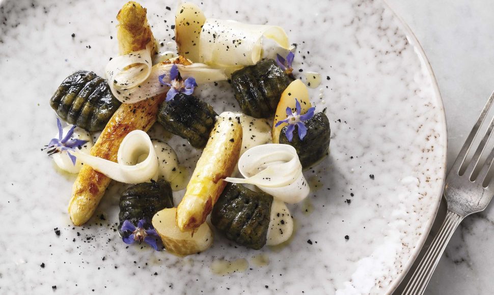 Gnocchi au charbon végétal et asperges blanches