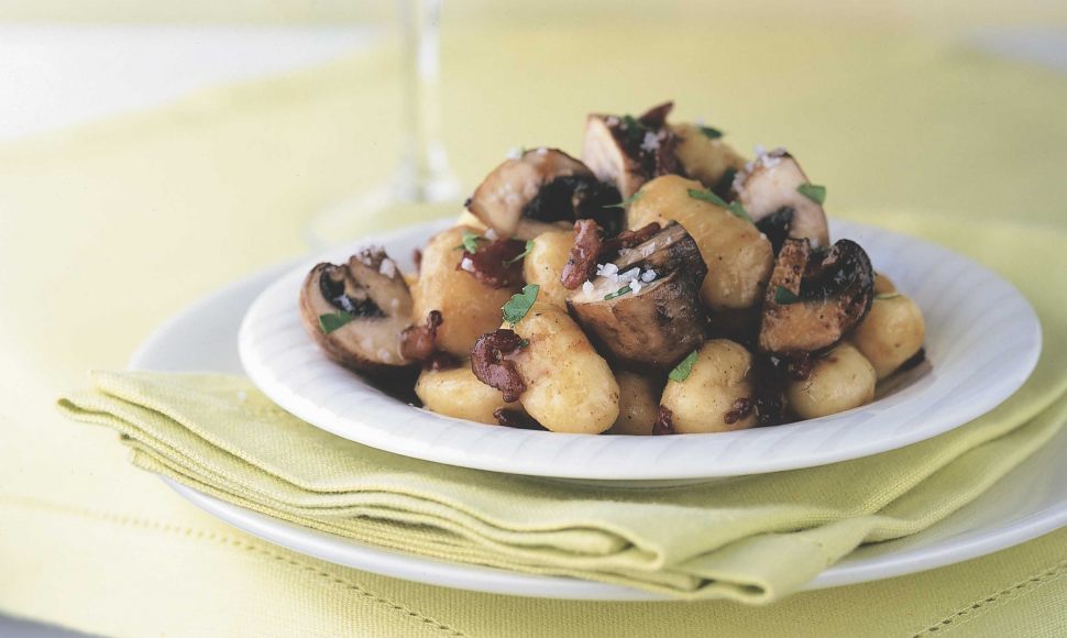 Un plat composé de gnocchi de pomme de terre aux cèpes, graisse de canard, lardons et parmesan.