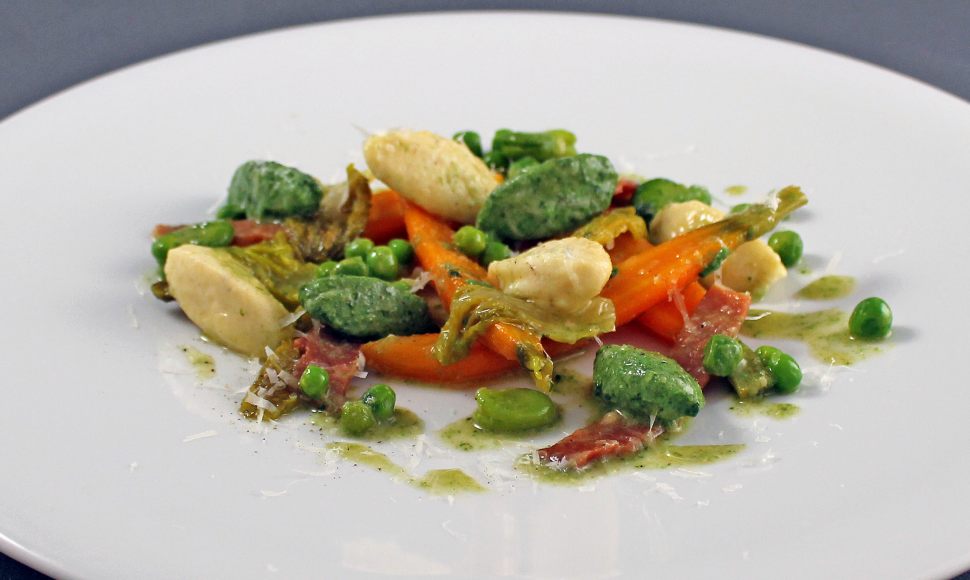 Gnocchi de ricotta en vert et blanc, légumes aux sucs de jambon