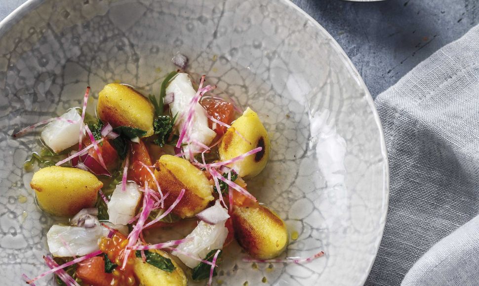 Des gnocchi à la daurade accompagnés de tomates mini-betterave chioggia et de feuilles de basilic.