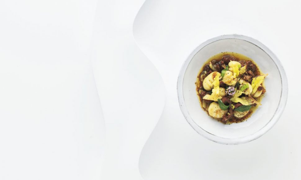 Gnocchi moelleux, oignon vert, épaule d’agneau confite
