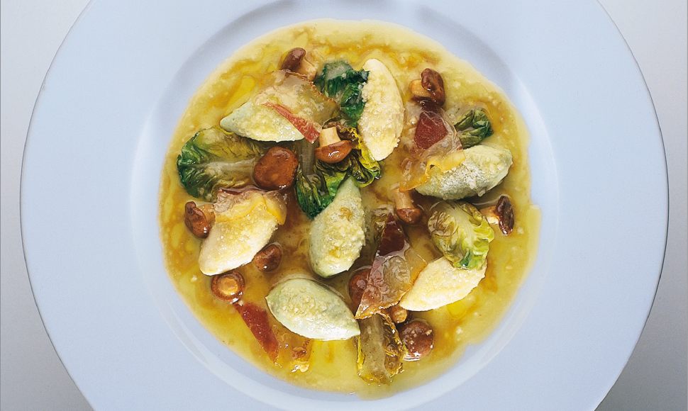 Gnocchi tendres de lait caillé en vert et blanc roulés au parmesan, des côtes de salade au jus de jambon
