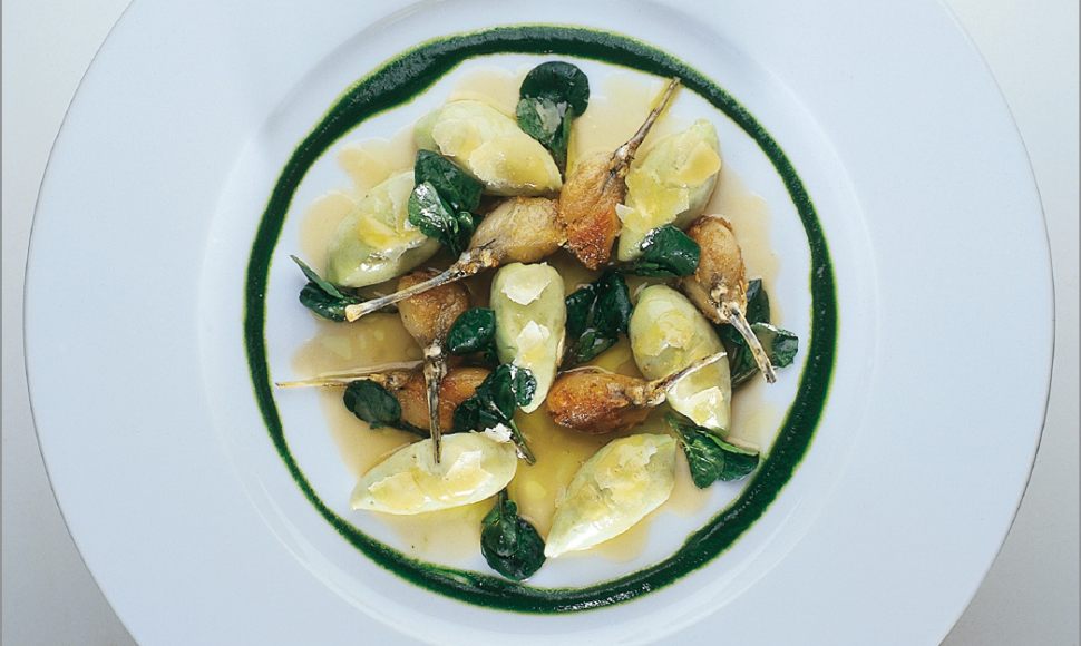 Les gnocchi se mettent au vert avec ce mélange de cresson, épinard et persil. Et pour accompagner ces tendres gnocchi, des cuisses de grenouilles poêlées. Versez délicatement le bouillon par dessus et vous obtiendrez un mets des plus raffiné.