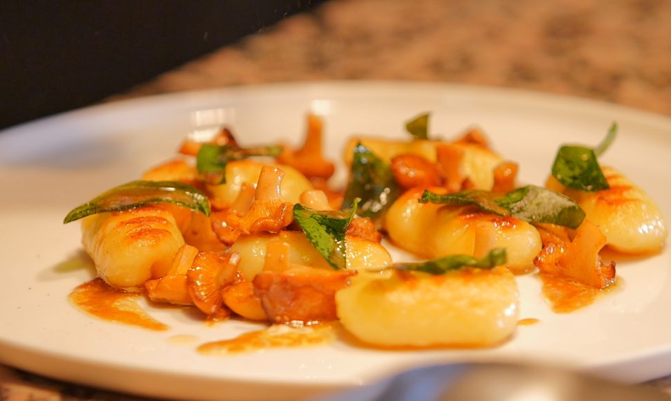 Dresser les gnocchis en les arrosant de jus de volaille chaud. Ajouter les girolles, les abricots et la verveine.