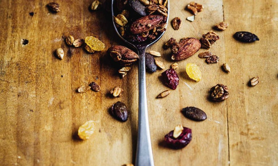 Laissez refroidir complètement à température ambiante, cassez les plaques en morceaux et mélangez-les aux fruits secs. Réservez dans une boîte hermétique à température ambiante.