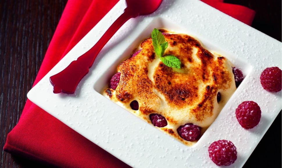 Répartissez la moitié de la préparation dans des ramequins. Disposez les framboises par-dessus puis recouvrez d’une seconde couche de crème. Au moment de servir, saupoudrez largement de sucre glace. Faites gratiner sous le grill du four, ou à l’aide d’un chalumeau. Servez tiède accompagné d’un coulis de framboise.