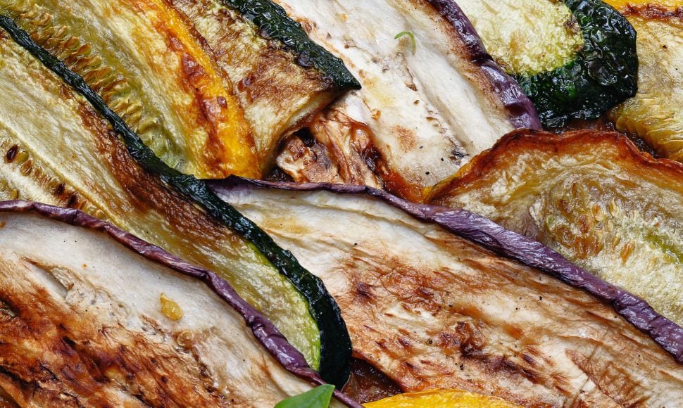 Laver les tomates, les couper en 6 tranches chacune et les réserver. Éplucher tous les poivrons au couteau économe. Les ouvrir en 2 et bien éliminer les graines et les filaments blancs. Puis les couper en lanières. Eplucher l’oignon blanc et le tailler de même. Eplucher et inciser la gousse d’ail. Réserver tous ces légumes ensemble dans un récipient. Laver, sécher l’aubergine et les courgettes. A la mandoline, les tailler en lamelles de 8 mm d’épaisseur environ. Les réserver séparément. Effeuiller les branches de basilic. Trier les petites feuilles et les réserver au frais. Ciseler les grosses et les garder à part sur une petite assiette.