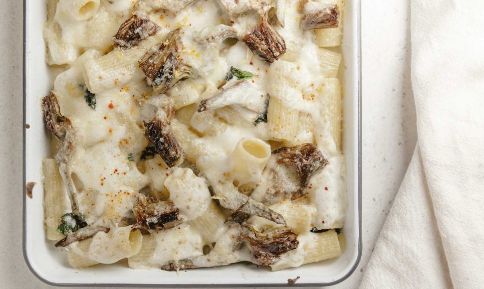 Un gratin de pâtes qui sort de l'ordinaire, doux grâce au lait ribot et parfumé par les artichauts , citron et menthe.