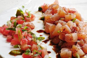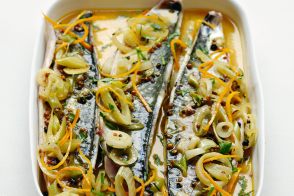 Tailler le filet de cabillaud en 4 pavés. Retirer la peau. Vérifier qu’il ne reste pas d’arêtes dans le filet. Les saler légèrement de chaque côté. Chauffer une poêle avec un filet d’huile d’olive et les faire revenir de chaque côté pendant 1 minute. Les débarrasser sur une plaque.