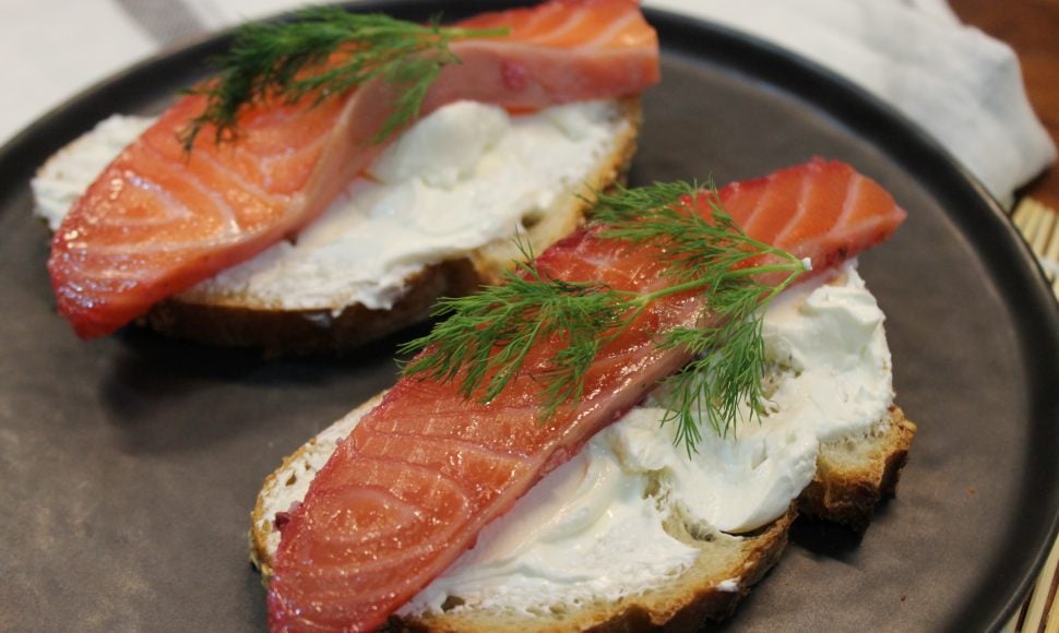 Déposer le saumon sur une planche propre et couper de fines tranches... à placer sur des tranches de pain de campagne recouvertes de fromage frais.