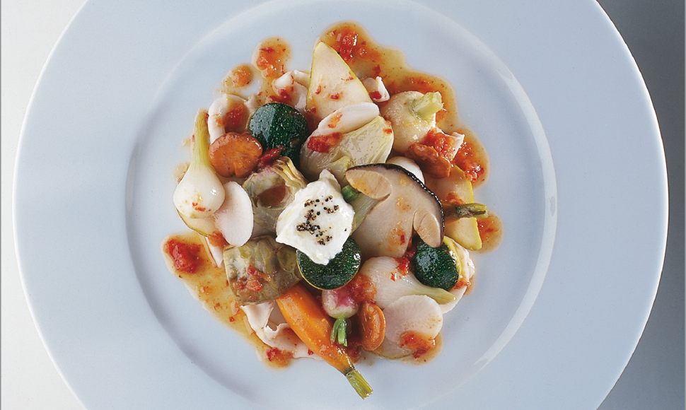 Grecque tiède de jeunes légumes, lard de porc de ferme, petits navets et poires en copeaux crus, caillé de brebis nappé d’une huile d’olives très mûres