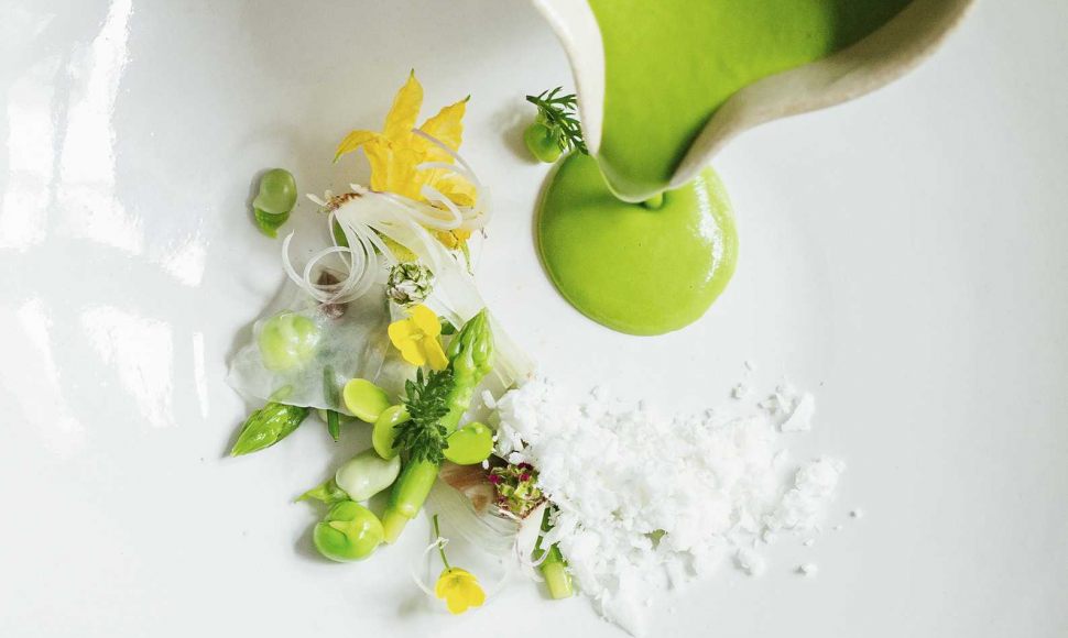 Déposez tous les légumes dans la cuve d’un blender avec les glaçons (réservez quelques pois blanchis pour le dressage) et les zestes de citrons. Réduisez-les en purée en ajoutant doucement l’huile d’olive. Faites en sorte de garder la purée froide pendant tout le processus. Salez et réservez au frais.