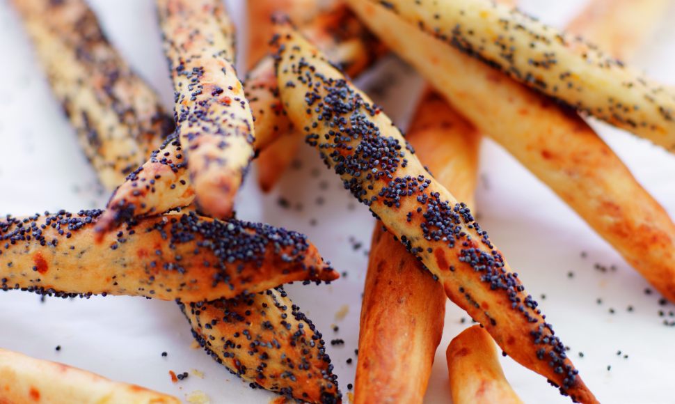 Détaillez la boule de pâte en petits pâtons, puis roulez-les sur le plan de travail ou entre vos mains pour les allonger et former des gressins de 10 cm de longueur environ. Dans une assiette, versez 2 cuillerées à soupe de graines de pavot. Roulez-y chaque pâton. Époussetez le surplus avec un pinceau, puis façonnez-les encore entre vos mains pour que les graines collent bien à la pâte. Tapissez une plaque de papier cuisson. Alignez les gressins côte à côte sans qu’ils se touchent.