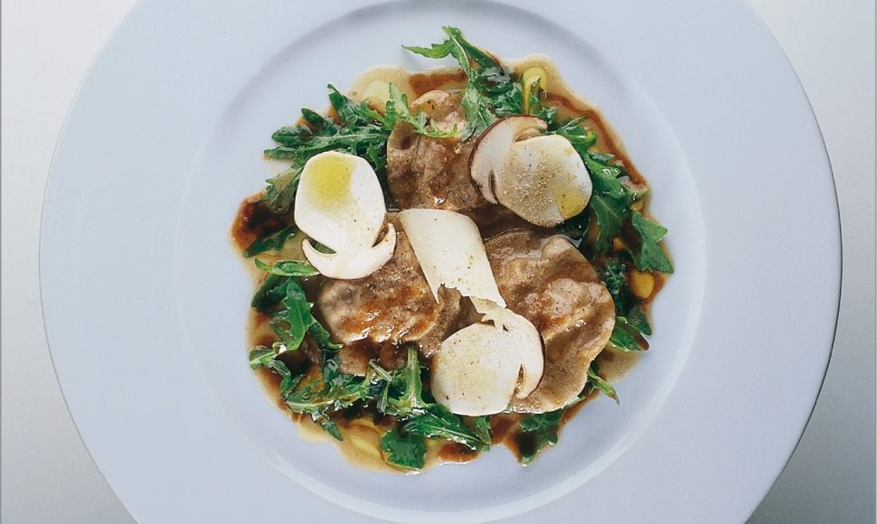Gros ravioli de cèpes à peine saucés, de la riquette à cru
