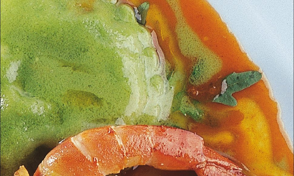 Gros ravioli verts aux brocoletti, gamberoni du golfe de gênes, jus de leurs têtes écrasées