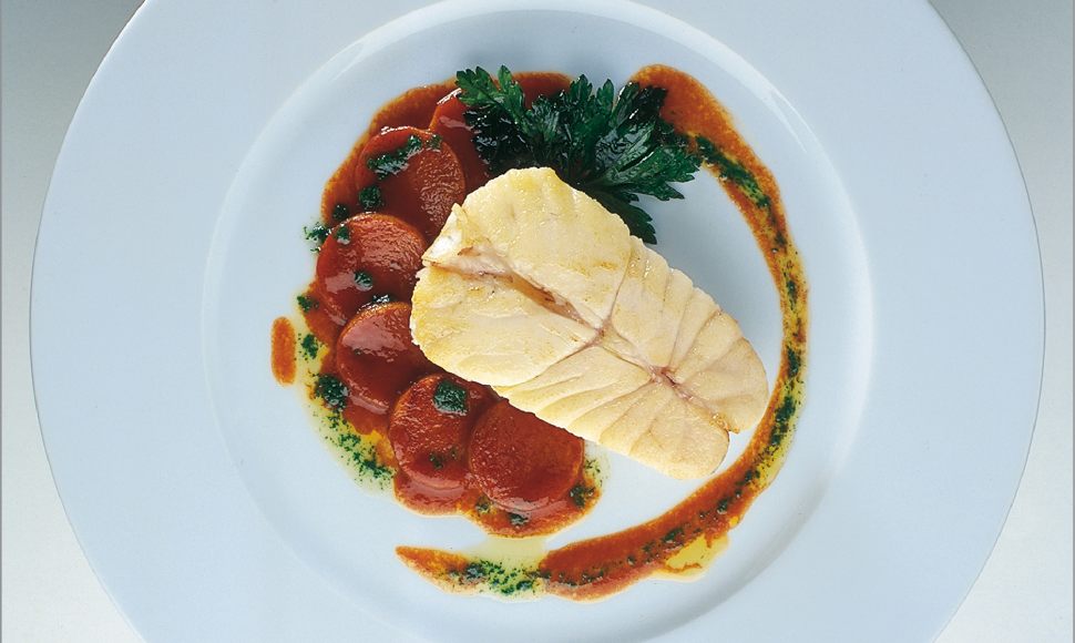 Gros turbot de ligne en tronçons rôti en cocotte, jus de ratatouille aux crustacés, des pommes fondantes