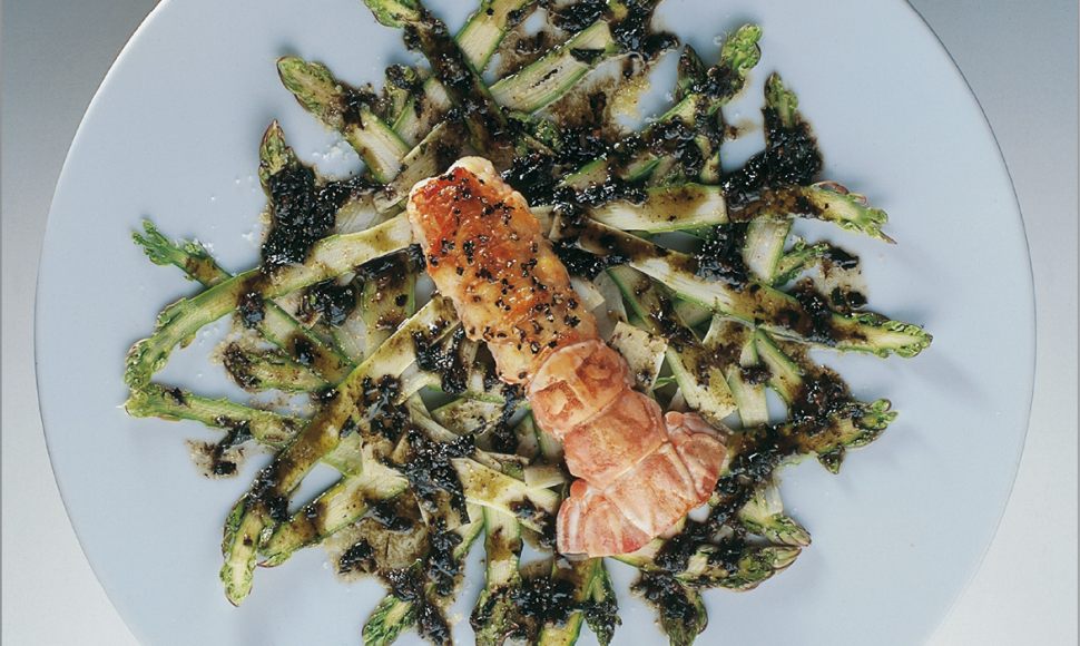 Grosse langoustine rôtie, marinade croquante d’asperges vertes, du pissalat pour assaisonner
