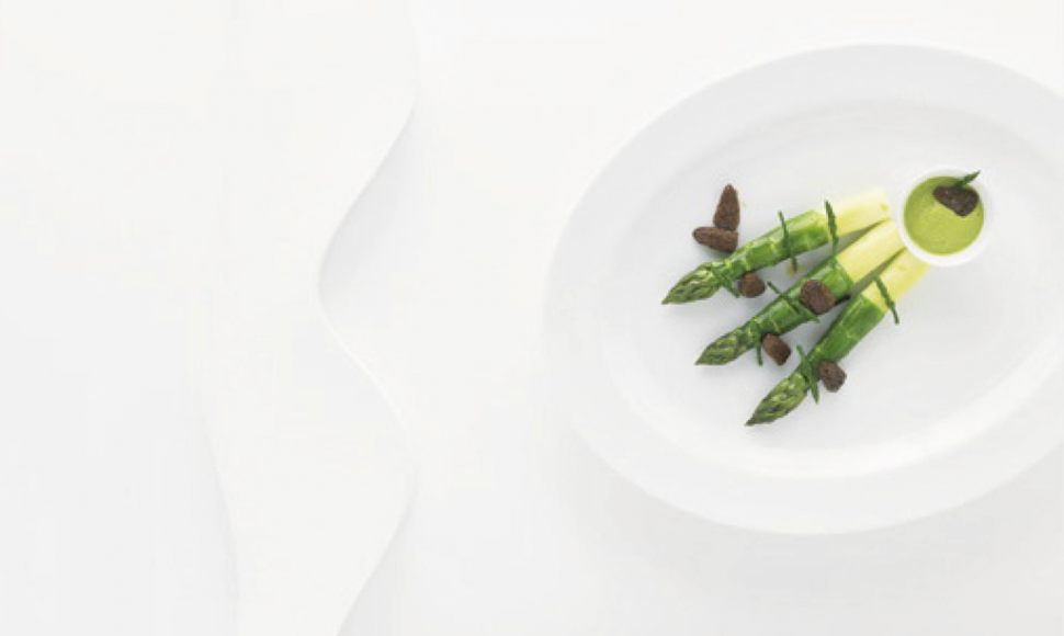 Grosses asperges de chez Robert Blanc pochées, sabayon asperges/morilles pour saucer