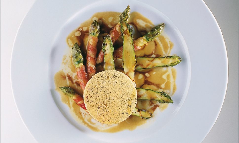 Grosses asperges vertes bourgeoises de chez robert blanc sur la braise, lard grillé, dentelle de vieux parmesan, émulsion d’huile d’olive et de vinaigre de modène