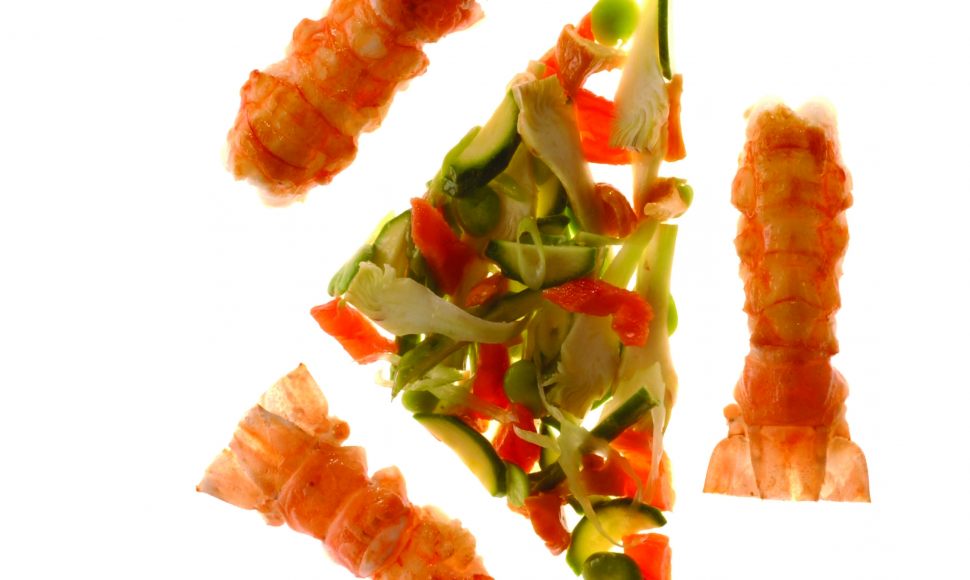 Grosses langoustines rôties, marinade croquante de jeunes légumes