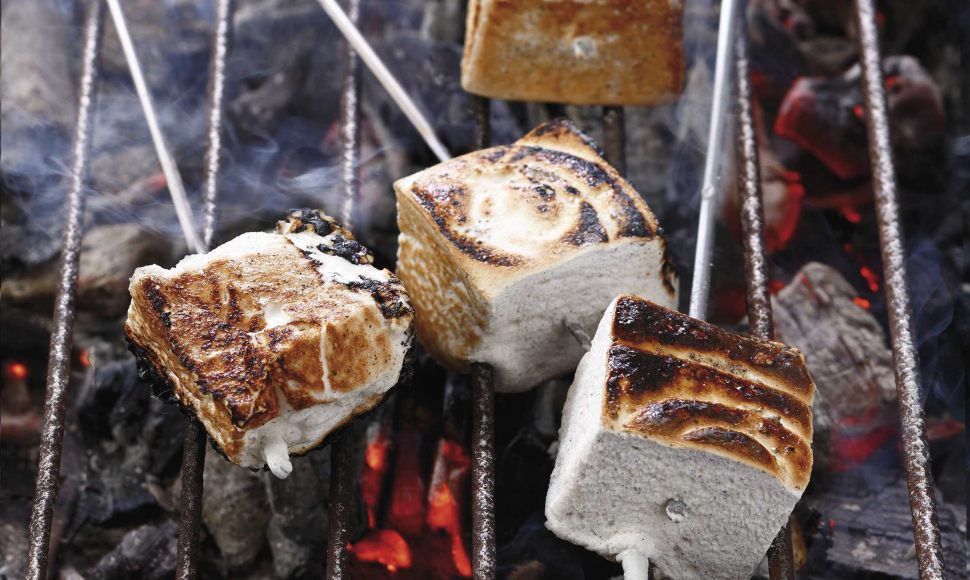 Des guimauves à la vanille, accompagnées d'un coulis de fraise. À partager fraîches et moelleuses, ou alors grillées et fondantes.