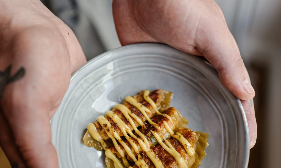 Gyoza de lapin aux coques, chorizo, gingembre et mayonnaise fumée