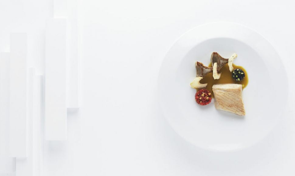 Halibut cuit doucement, artichauts condimentés tomate truffe noire, jus aromatique
