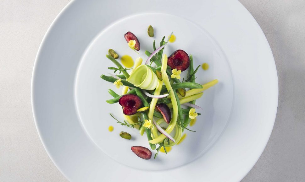 Disposer les haricots pour donner du volume, ajouter les tranches de courgette, les cerises, les fleurs d’oxalis et les fleurs de stellaire, assaisonner la salade avec la vinaigrette et la fleur de sel. Terminer avec l’oignon rouge coupé en julienne fine, 5 pistaches par assiette et quelques feuilles de roquette sauvage.