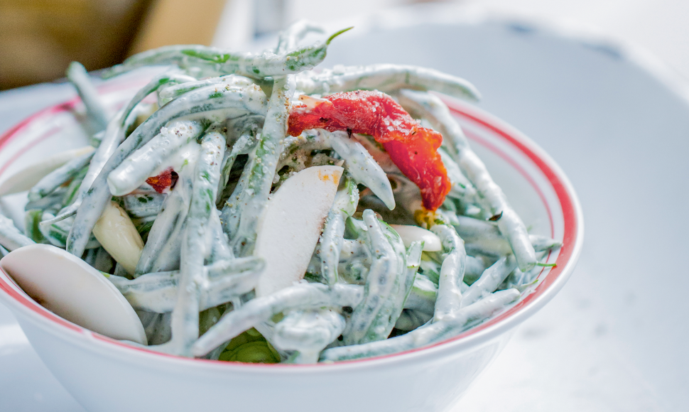 Une salade rafraîchissante et croquant typique de la capitale : des haricots verts blanchis et craquants, une pointe de crème citronnée, des champignons de Paris, des amandes et de la laitue.