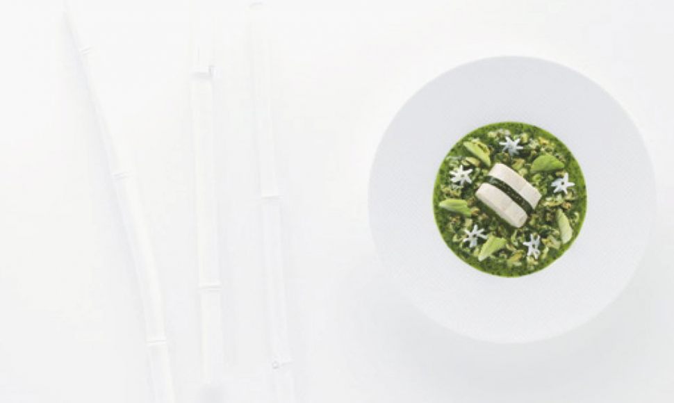 Hiramasa cuit à la vapeur d’algues, coquillages aux herbes fraîches et côtes de romaine